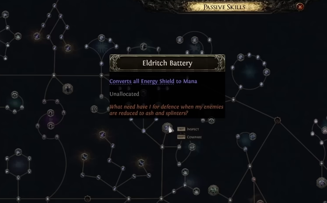 Eldritch Battery is a keystone passive that makes Energy Shield (ES) protect your Mana instead of your Life.